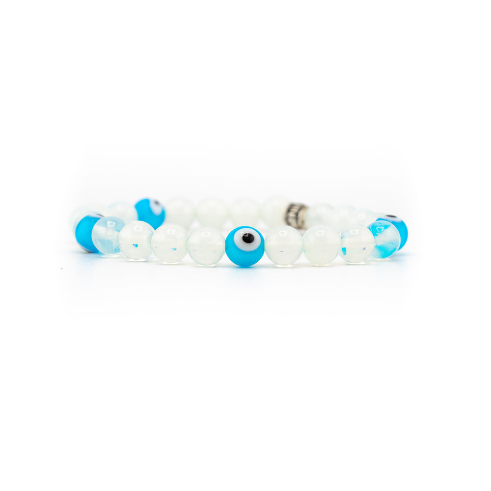 Natural Clear Quartz & Lampwork Evil Eye Charm Bracelet - 8mm Beads, Crystal Healer