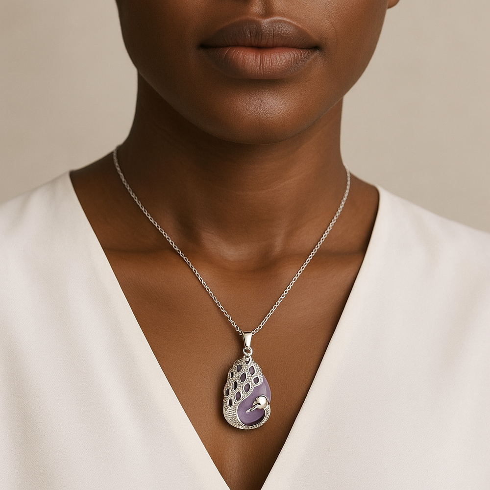 Handcrafted Teardrop Necklace - Natural Amethyst Gemstone with Peacock Motif