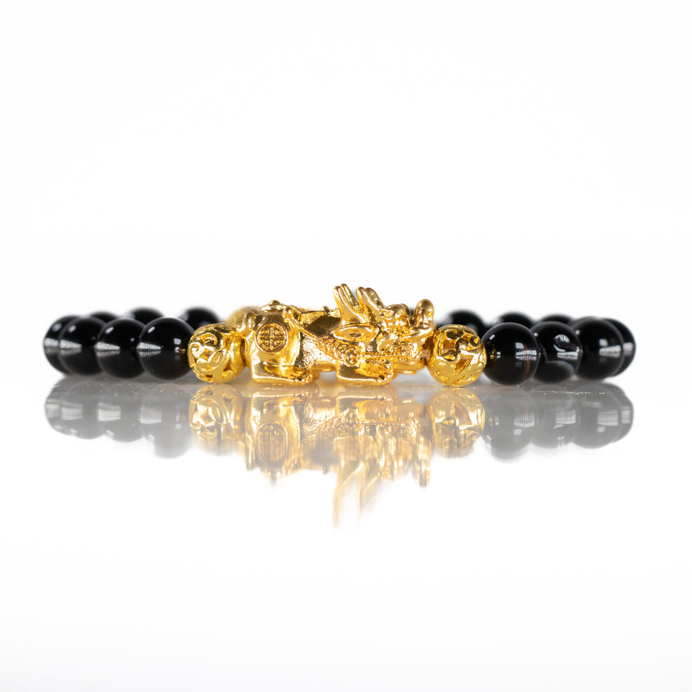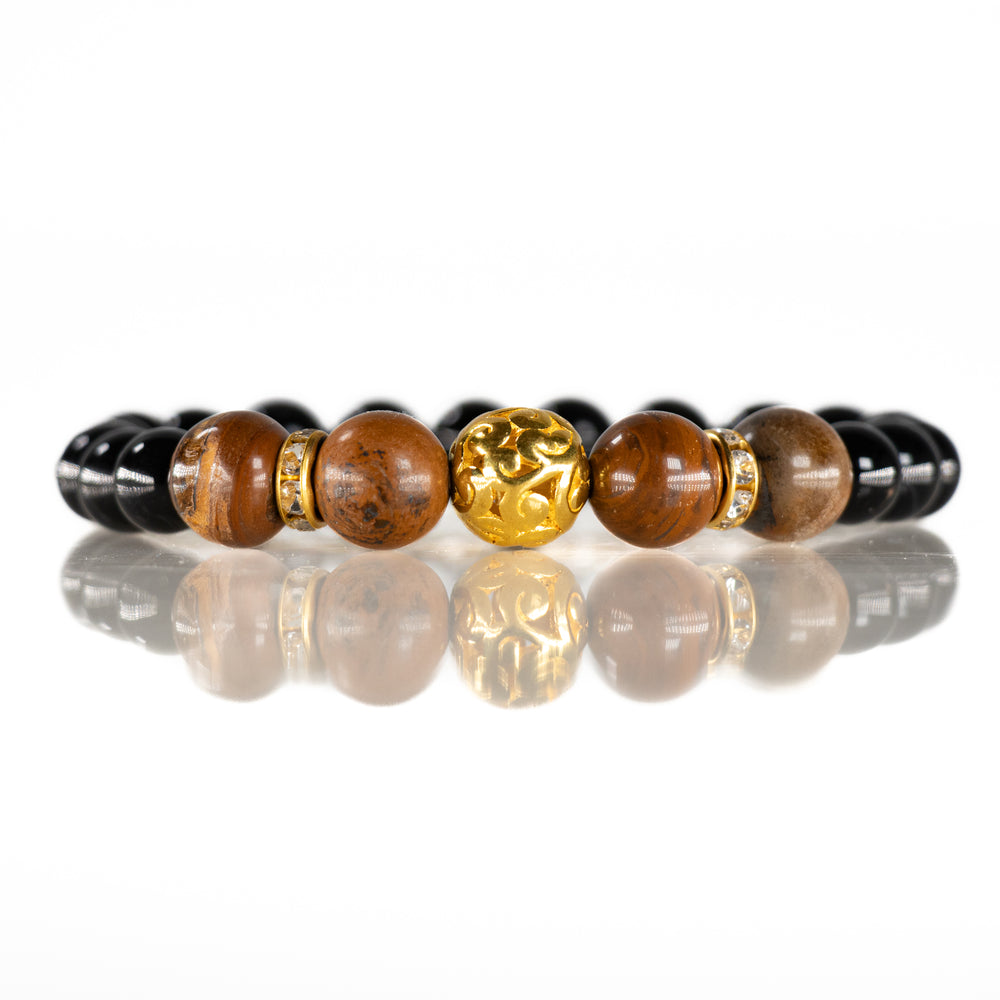 Natural Black Onyx with Tiger Eye Gemstone Bracelet with Gold Charm - 8mm