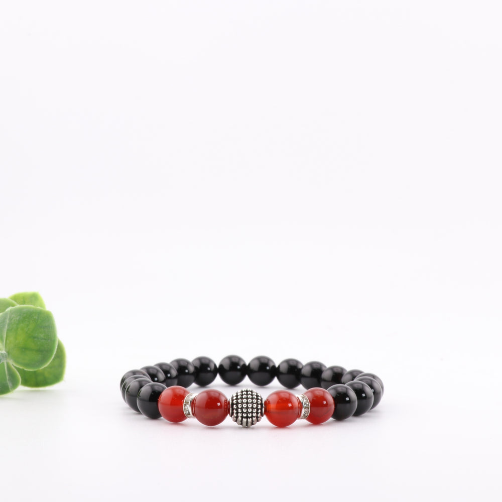 Natural Black Onyx & Carnelian Charm Bracelet - Stylish 8mm Silver Beads, Crystal Energy Jewelry