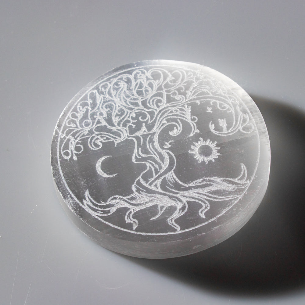 Natural Selenite Tree of Life Engraved Round Charging Plate - 3 Inches Selenite Crystal - Cleansing & Recharging Healing Stone