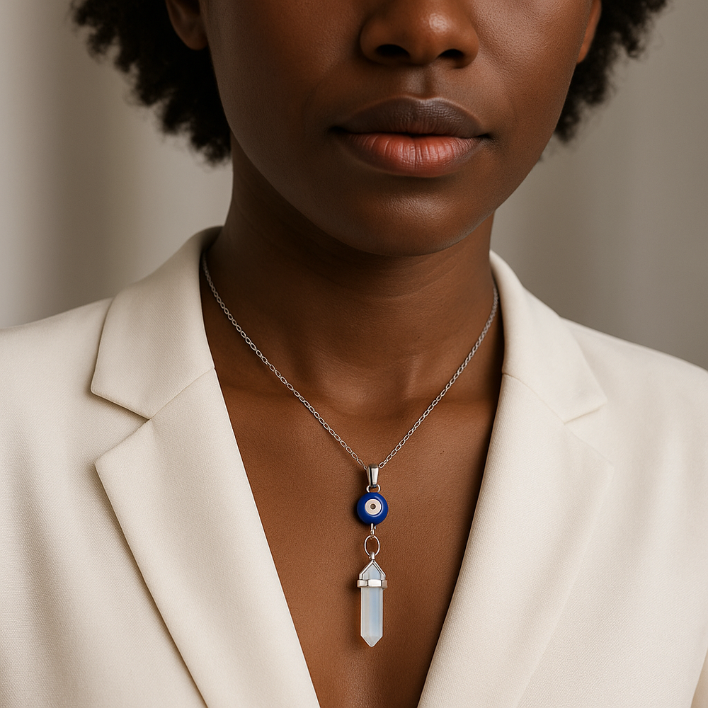 Opalite Stone Point Pendant Necklace with Evil Eye Charm - Handcrafted Crystal Jewelry
