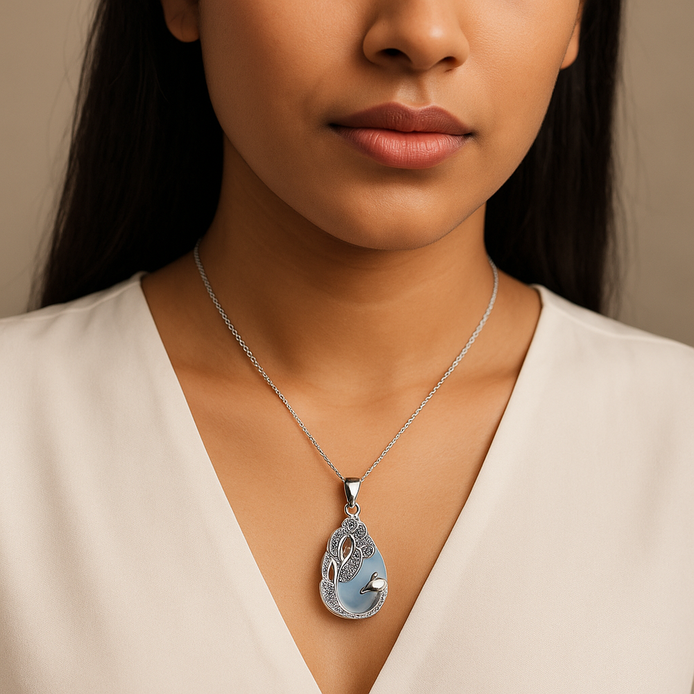Handcrafted Teardrop Necklace - Opalite Gemstone with Peacock Motif