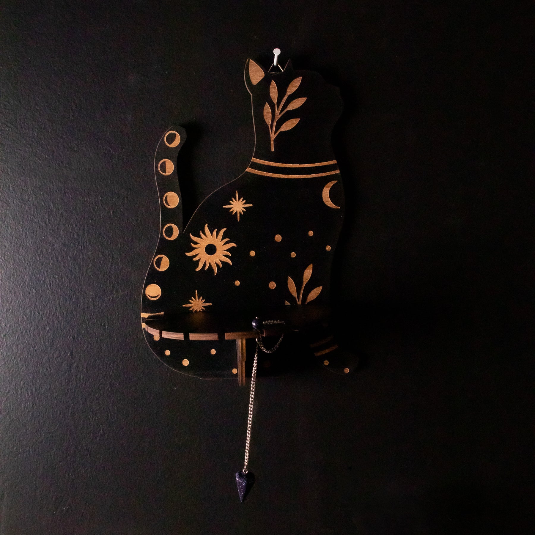 Invite a touch of feline magic into your sacred space with the Mystic Cat Pendulum Holder. This striking silhouette captures the elegance of a guardian cat, laser-cut from dark wood and illuminated with intricate, gold-toned engravings.