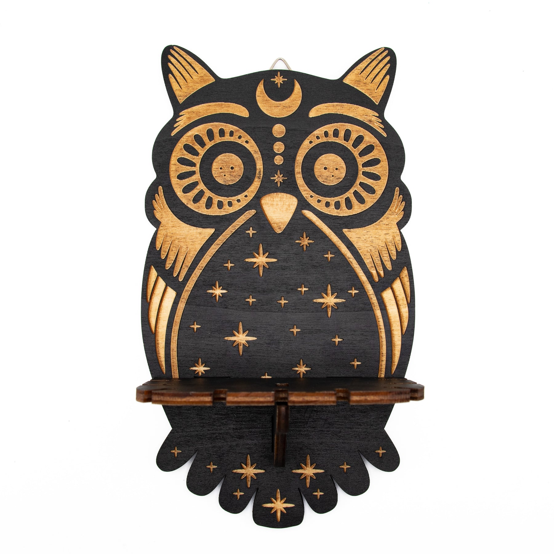 The striking design features a large owl intricately detailed with a celestial motif, including a crescent moon, stylized suns, and a constellation of stars laser-cut into the dark wood. This blend of ancient wisdom and cosmic energy makes it an essential piece for any altar, sacred space, or desk.