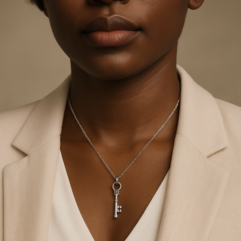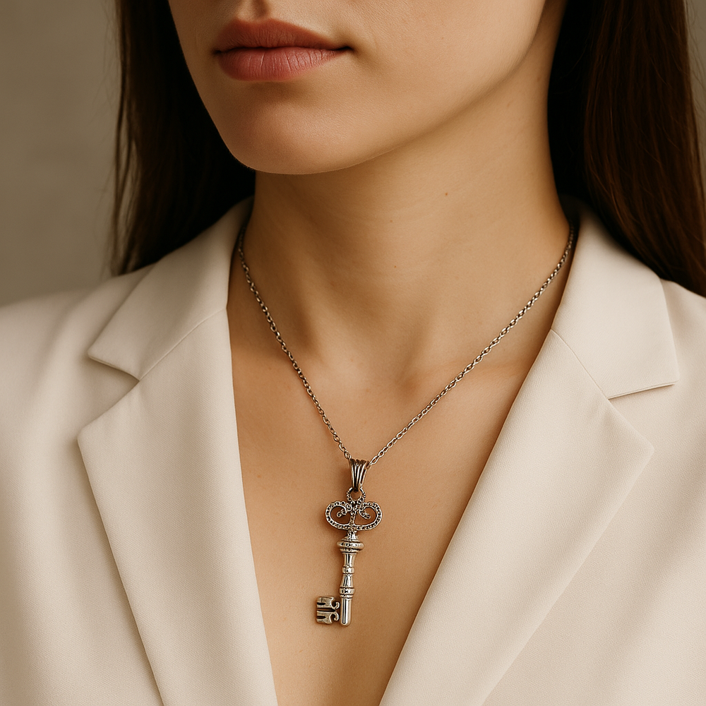 Silver-Colored Key Shaped Brass Pendant - Handcrafted Artisan Jewelry