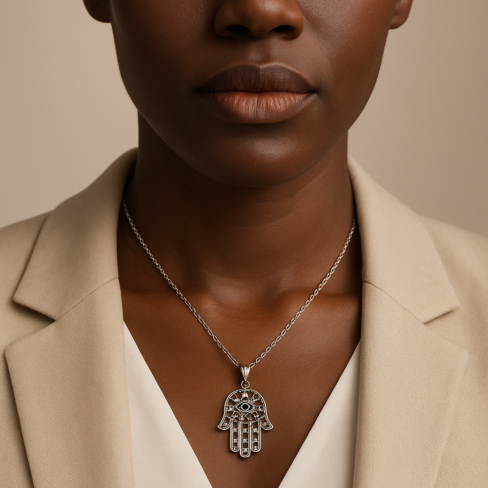 Silver-Colored Hamsa Hand Brass Pendant - Spiritual Chic Necklace, Hand of Fatima