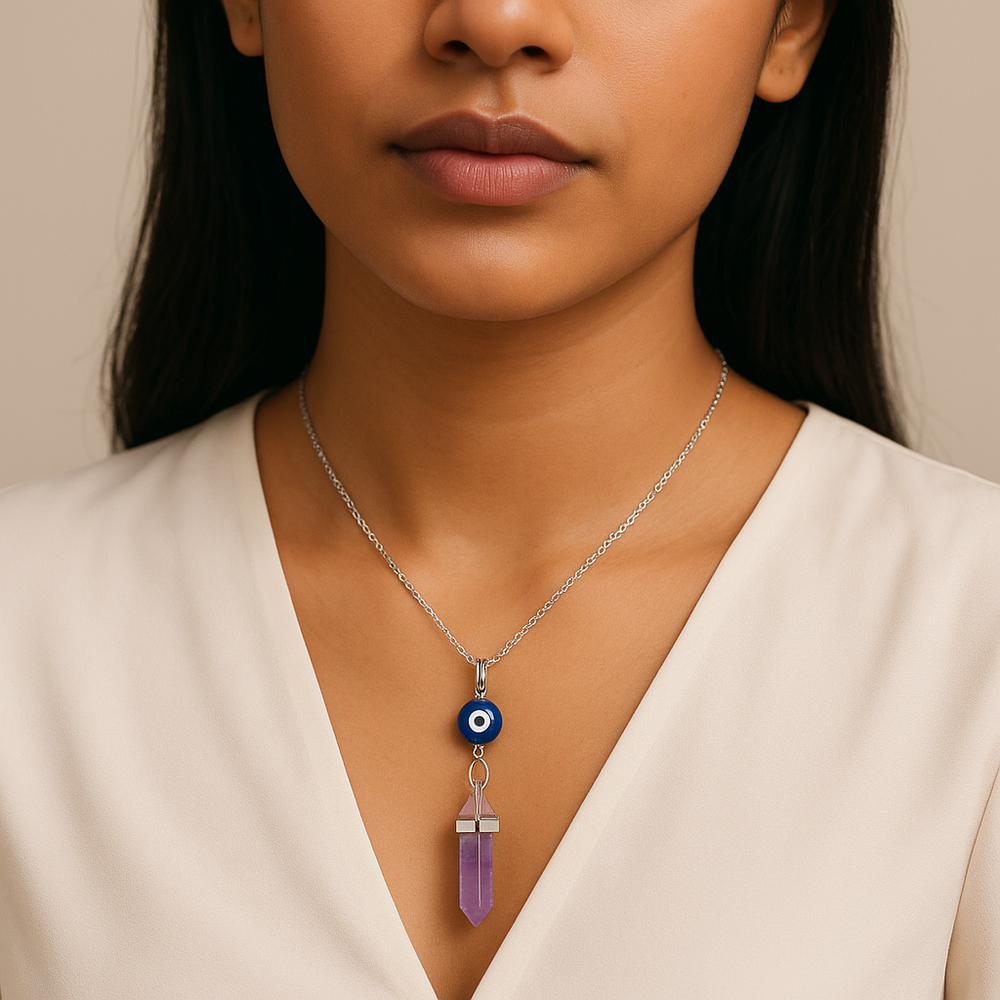 Amethyst Stone Point Pendant Necklace with Evil Eye Charm - Handcrafted Crystal Jewelry