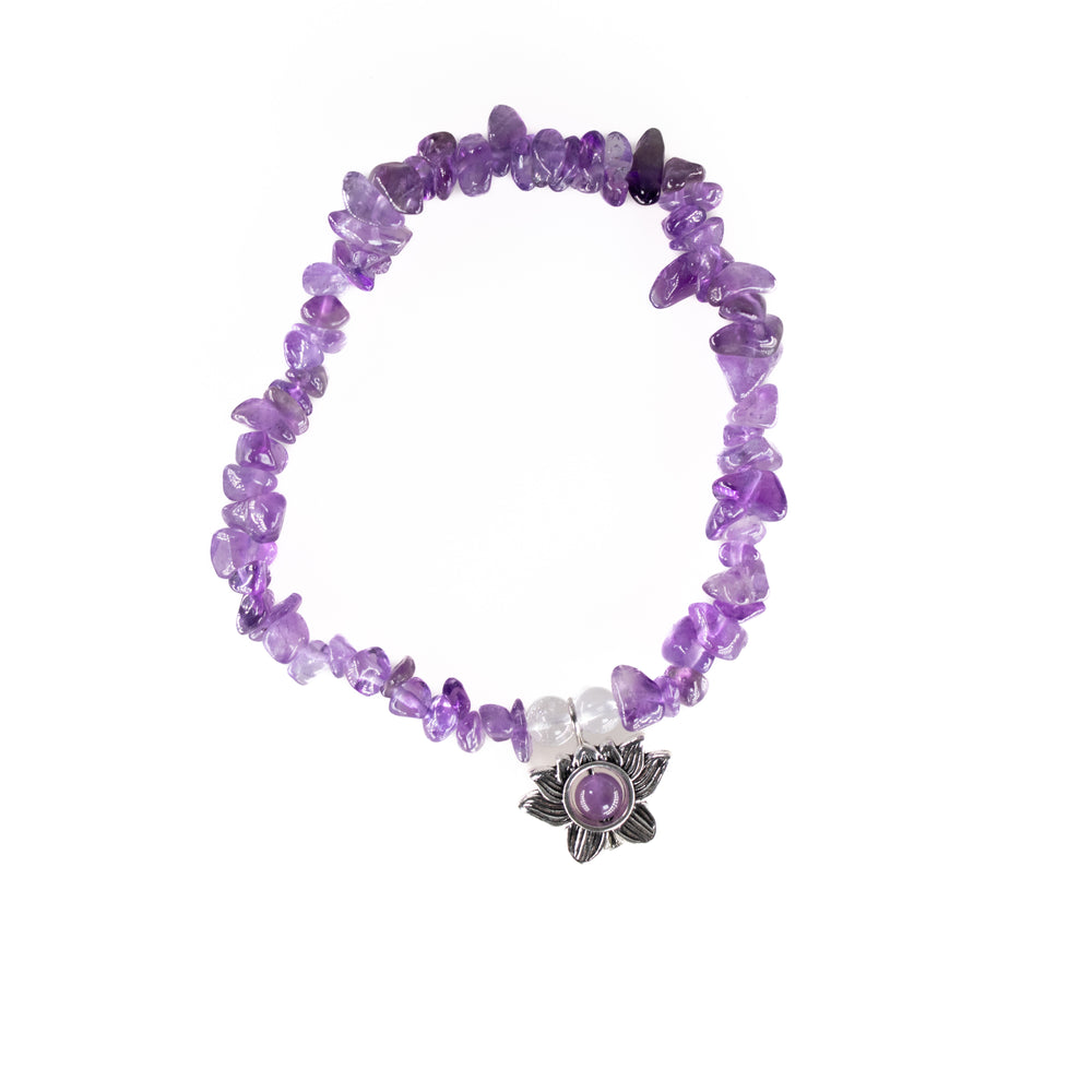 Natural Amethyst Chip Stone Bracelet with Lotus Charm – Metal-Free, 5-8mm