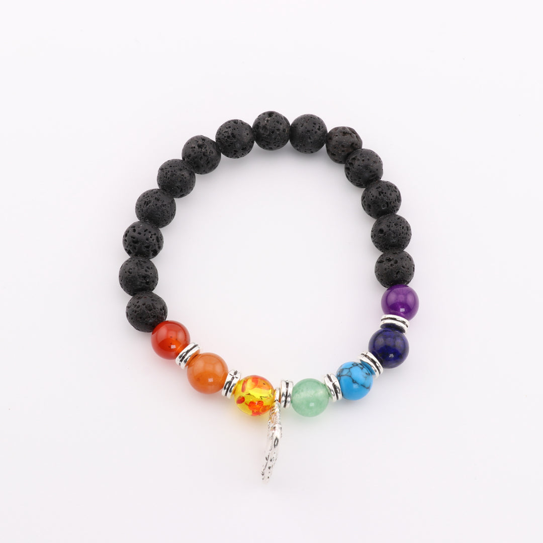 Beads: 8mm round beads of natural Lava Stone and Seven Chakra stones (Amethyst, Lapis Lazuli, Turquoise, Green Aventurine, Amber, Carnelian, Red Agate)