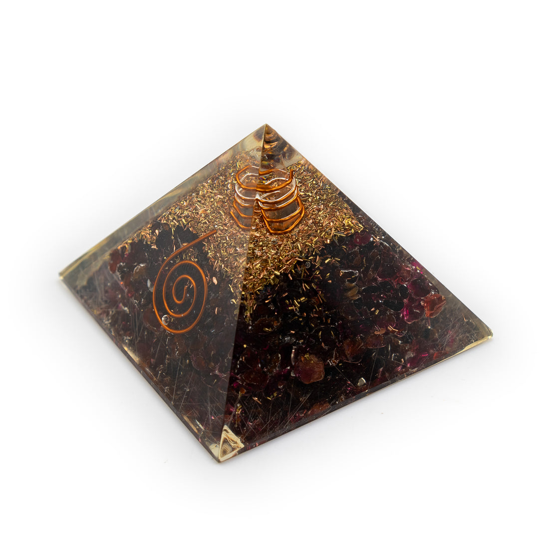 Rich in deep crimson hues and fiery energy, this Garnet Orgonite Pyramid is a beacon of vitality, grounding, and inner strength.