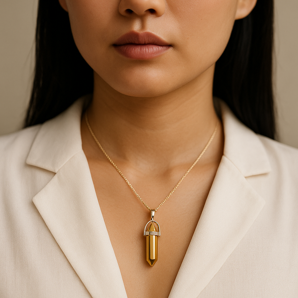 Collar con colgante de punta de cuarzo sintético dorado hecho a mano