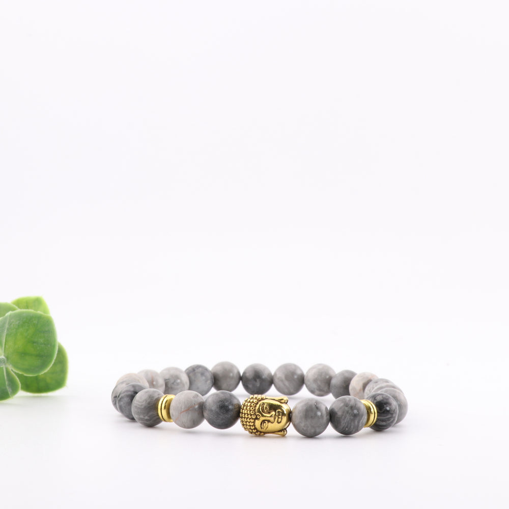Bracelet en jaspe gris naturel avec tête de Bouddha dorée - Perles de 8 mm - Bijoux en cristal de guérison